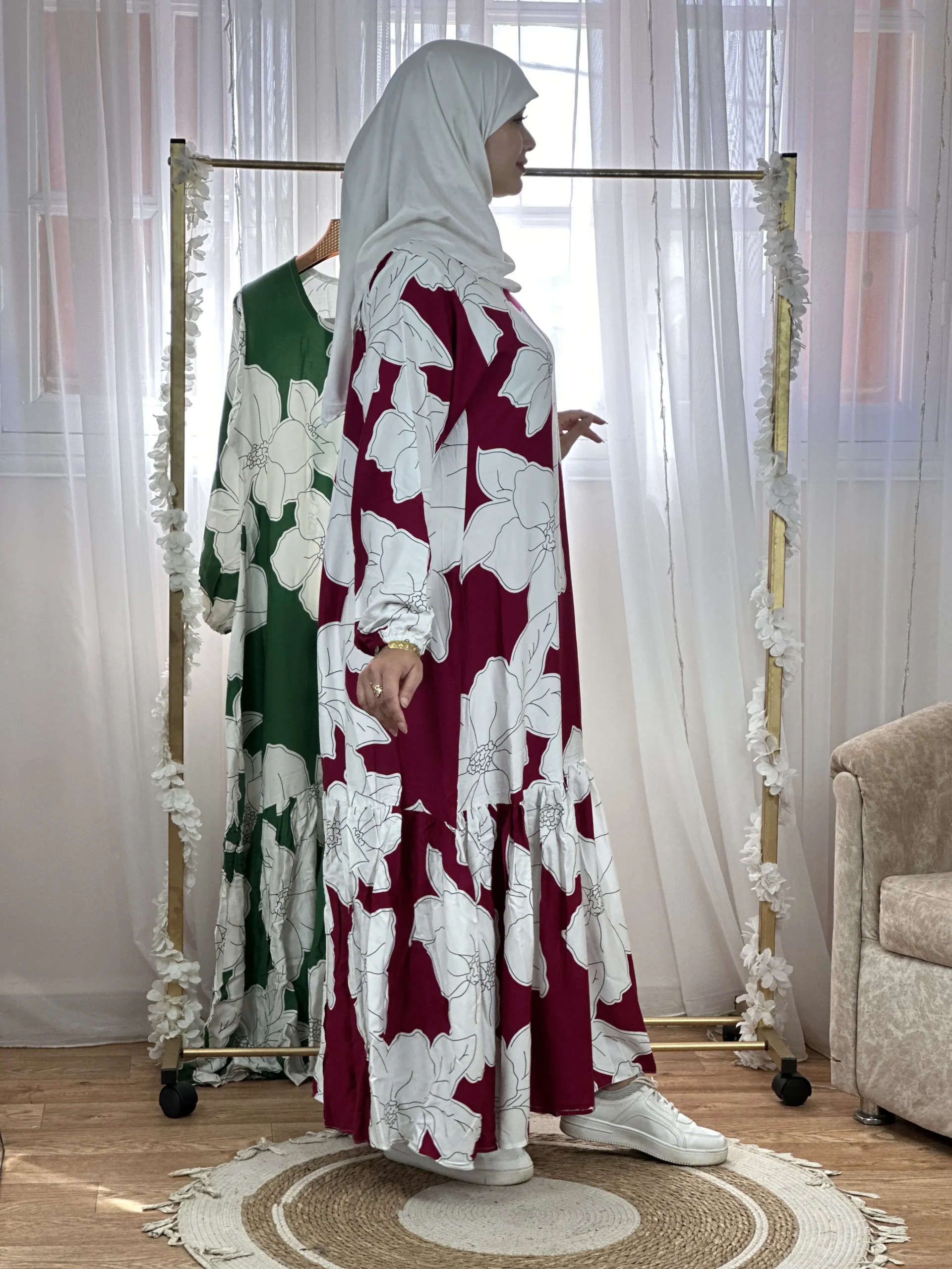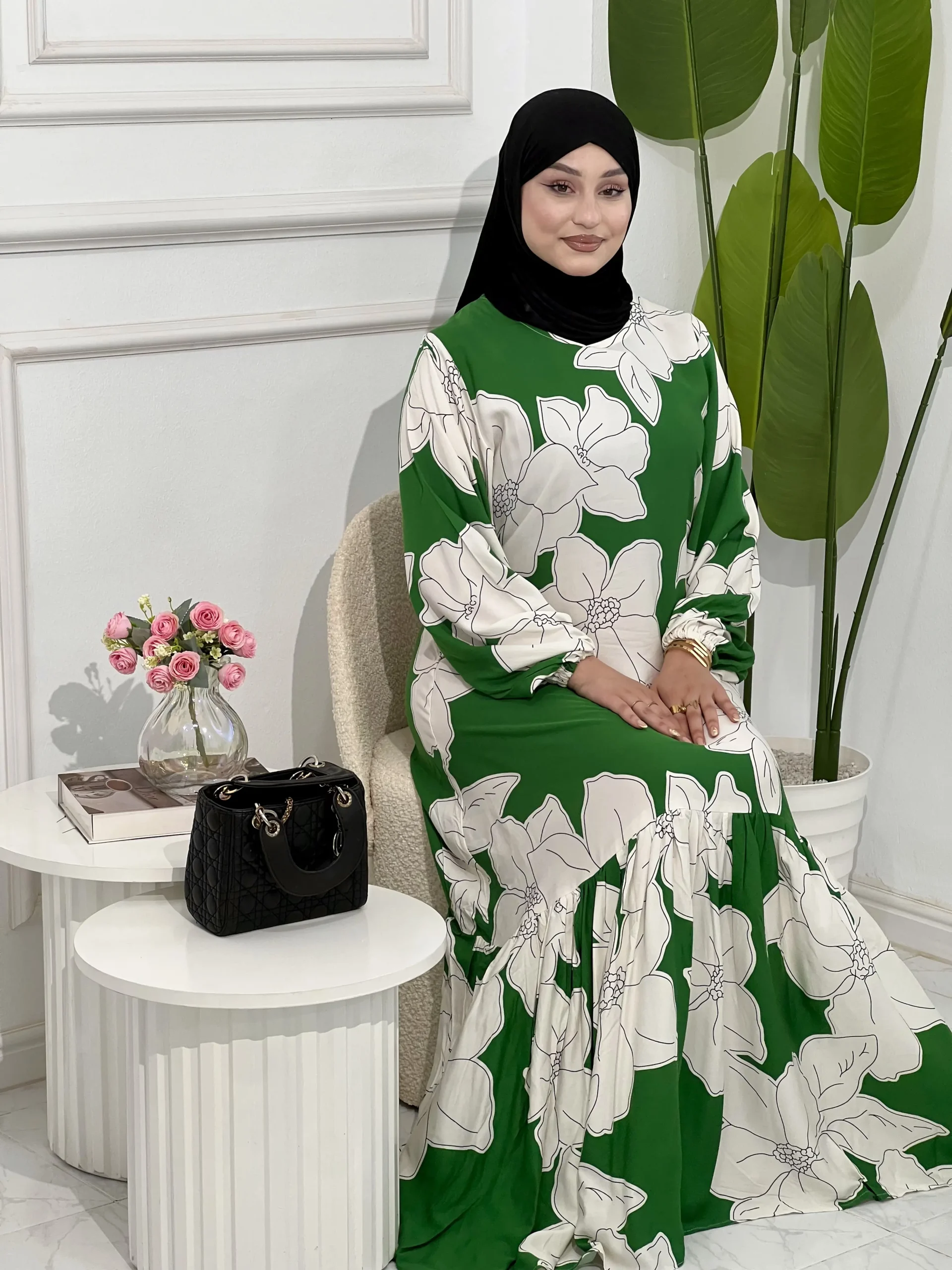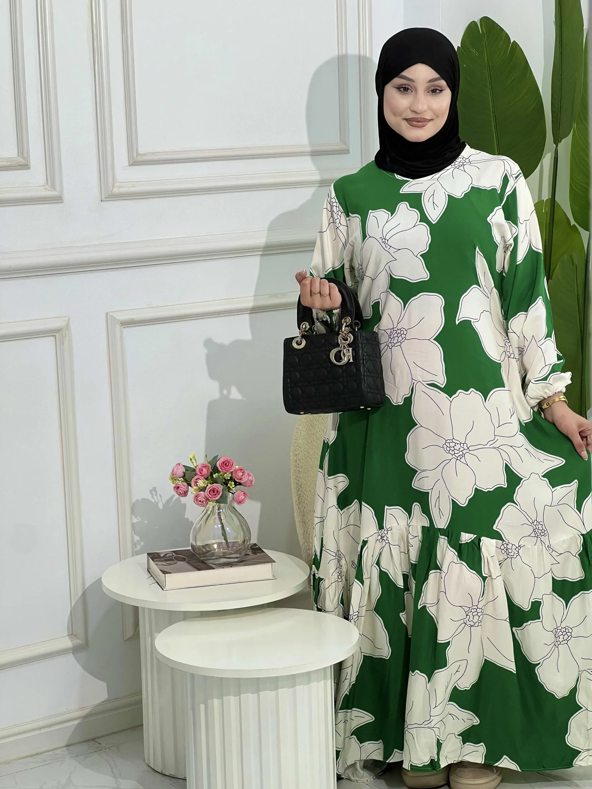 تمتعي بإطلالة مميزة وعصرية مع هذا الفستان الرائع الذي يجمع بين الفخامة والاحتشام في تصميم واحد. زهور بيضاء ناصعة تتوزع بانسيابية على خلفية خضراء جذابة، لتخلق لوحة فنية تبرز أناقتكِ وذوقكِ الرفيع.