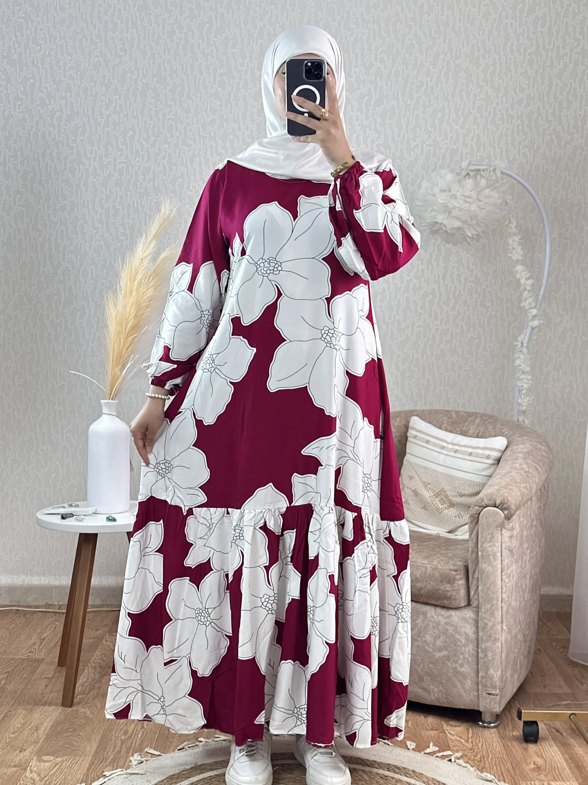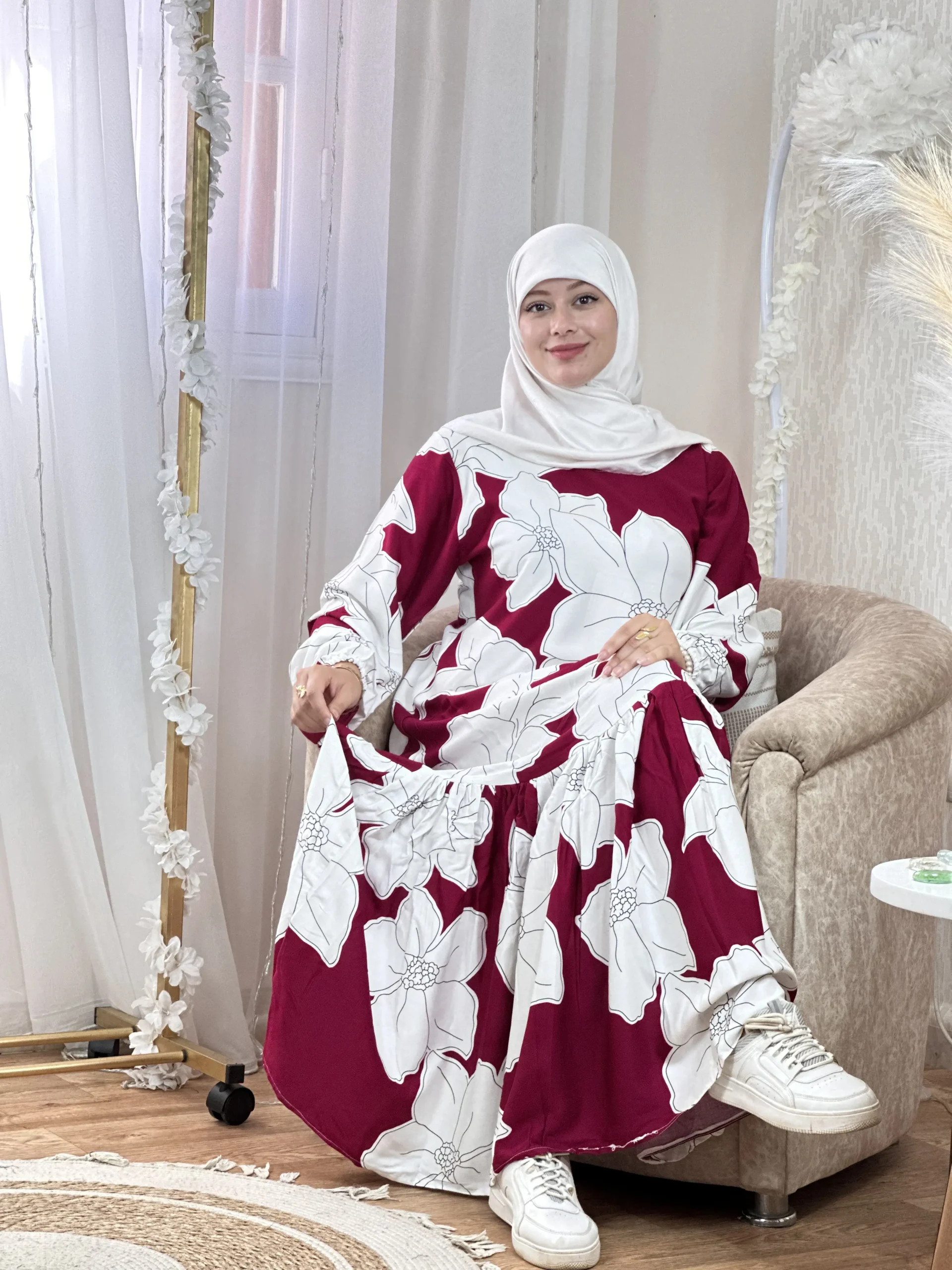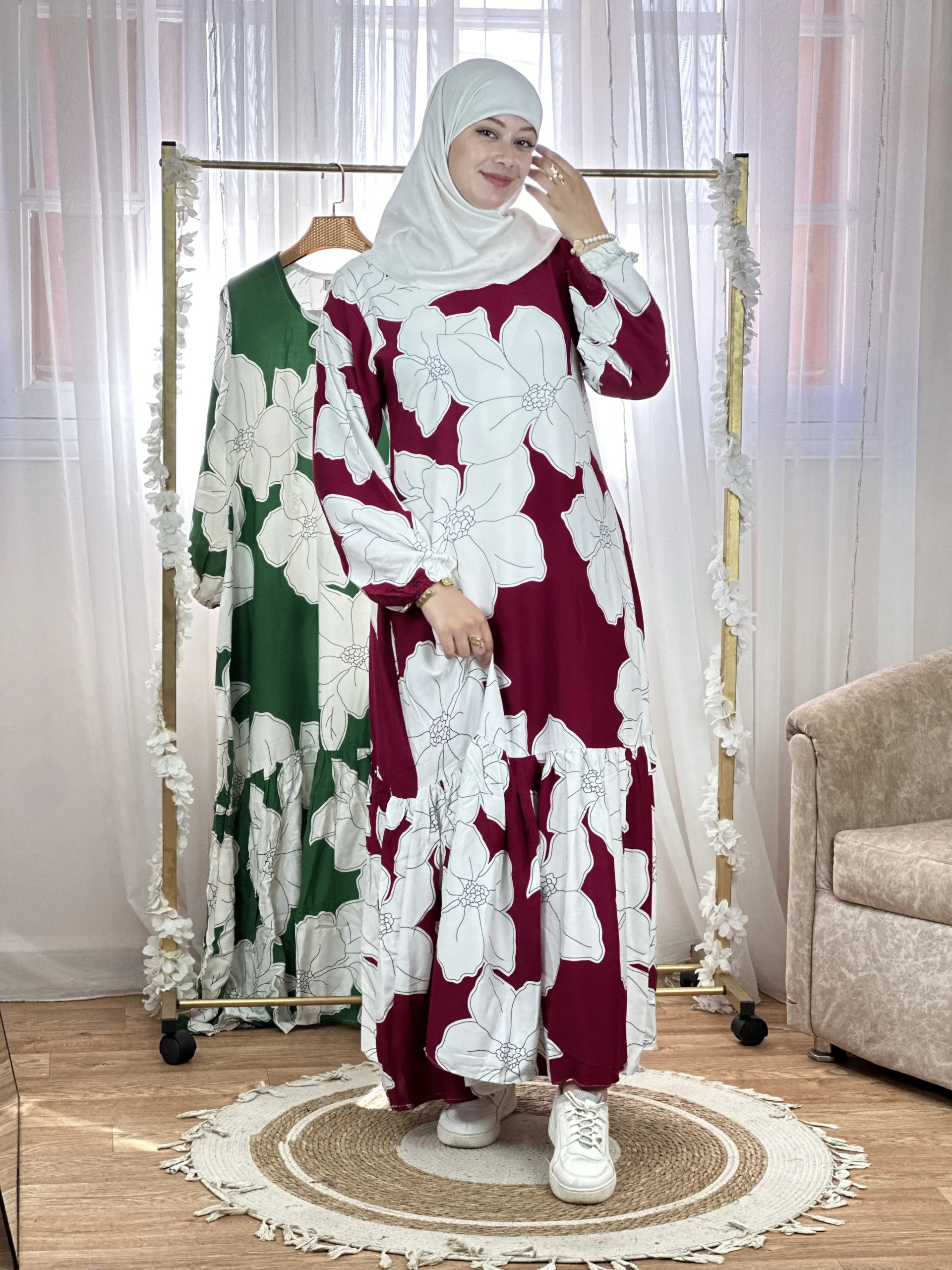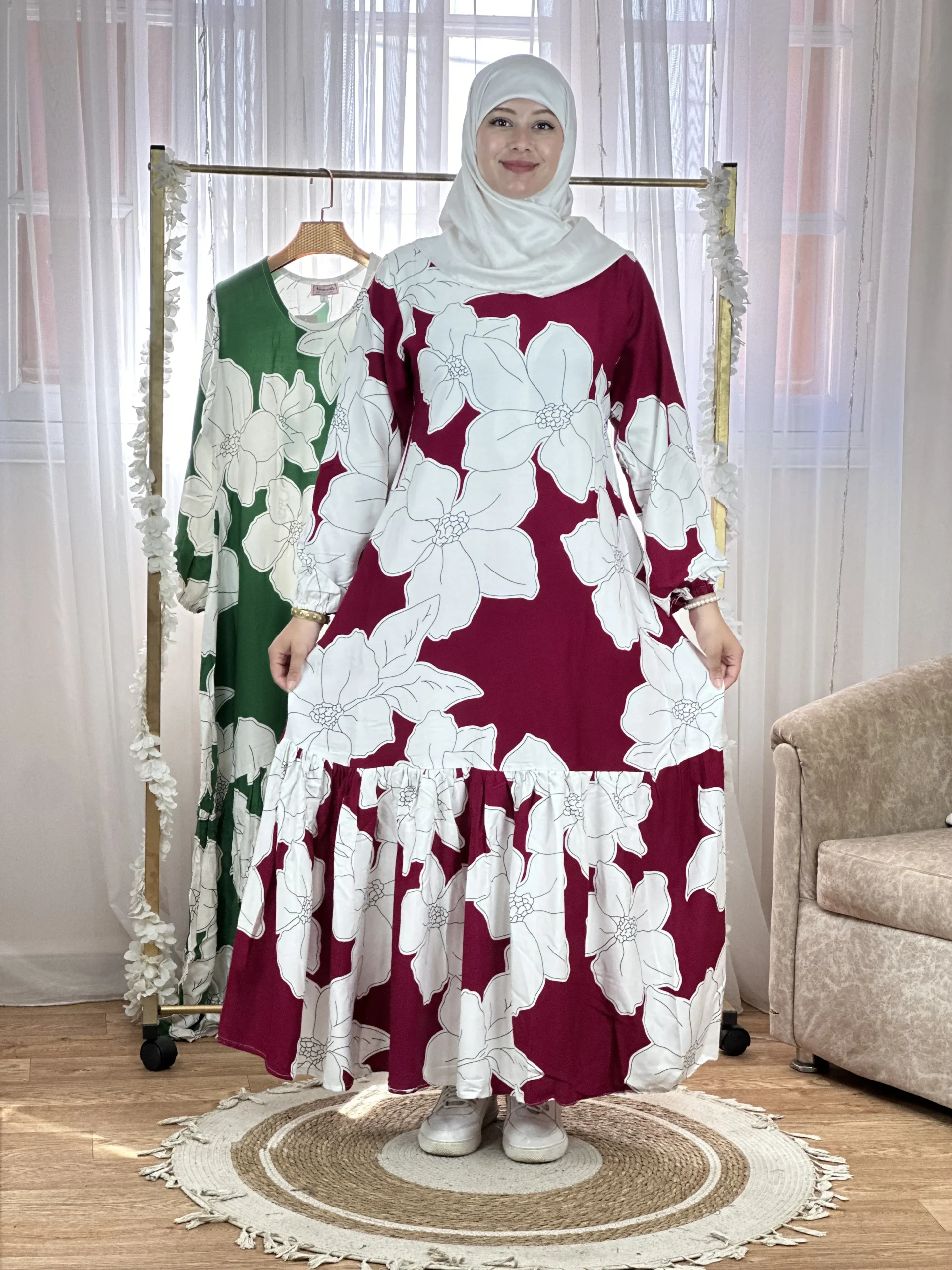 تمتعي بإطلالة مميزة وعصرية مع هذا الفستان الرائع الذي يجمع بين الفخامة والاحتشام في تصميم واحد. زهور بيضاء ناصعة تتوزع بانسيابية على خلفية خضراء جذابة، لتخلق لوحة فنية تبرز أناقتكِ وذوقكِ الرفيع.